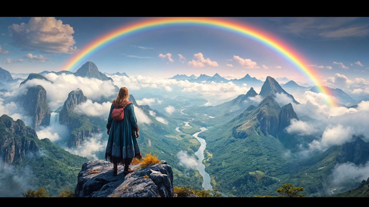 This image shows a vibrant landscape of mountains and streams under a rainbow. The detailed matte painting features deep colors and intricate details, creating a fantastical scene in 8k resolution.