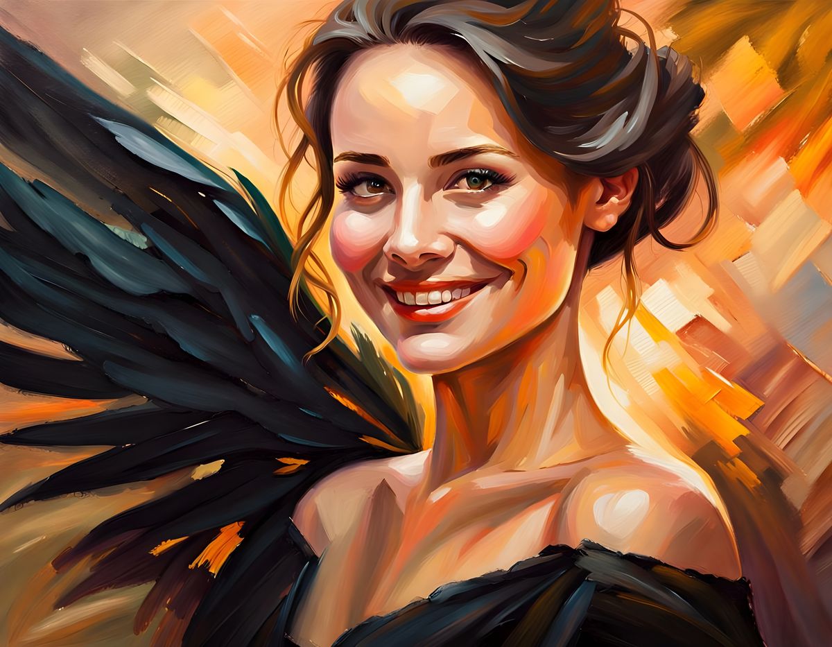 This oil painting showcases a close-up portrait of a charming brunette woman with a black wing, set against a warm golden sunset background with soft brushstrokes and blended textures, evoking a serene and magical atmosphere.