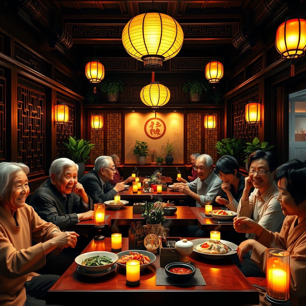 This image shows a cozy, warmly lit Asian restaurant with dark wooden interiors. The scene depicts patrons enjoying authentic cuisine amidst soft lighting, steam, and vibrant greenery in a 3D rendered style.
