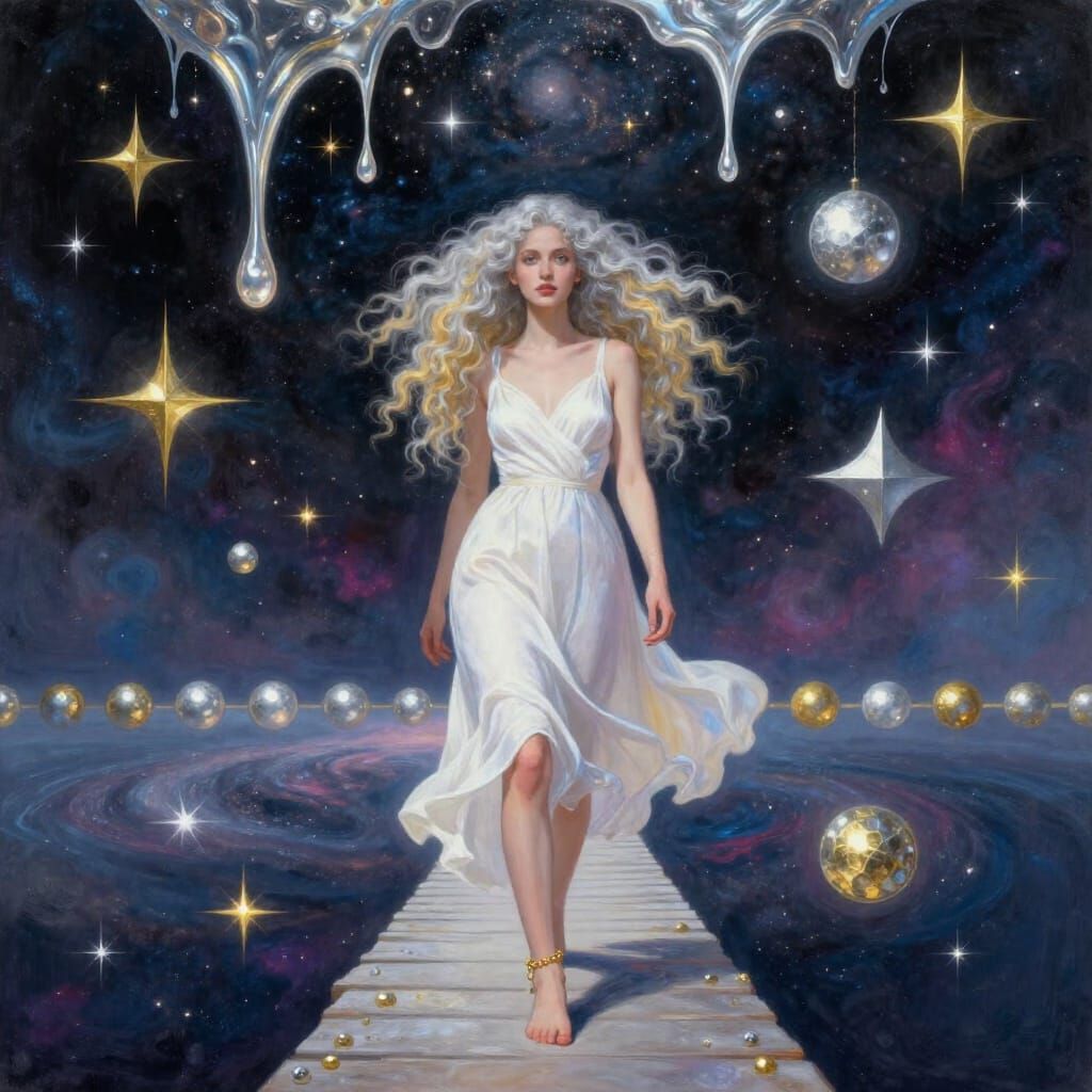 This image shows a woman with silver and gold hair walking barefoot on a bridge that merges with the starry universe. Digital art with vibrant, ethereal lighting.