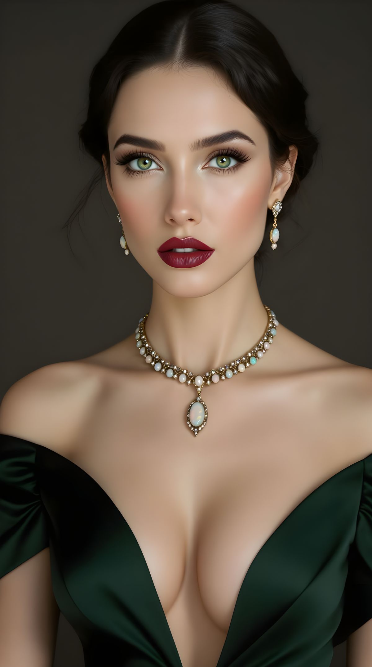 This image showcases a stunning woman with porcelain skin and piercing emerald eyes, adorned in a dark green dress and antique-inspired opal necklace, set against a muted charcoal background.
