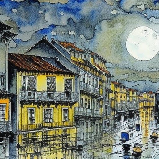 This image shows a quaint Portuguese street scene at night. Street lights glow in the rain under a full moon, with watercolor and ink techniques creating a painterly effect.