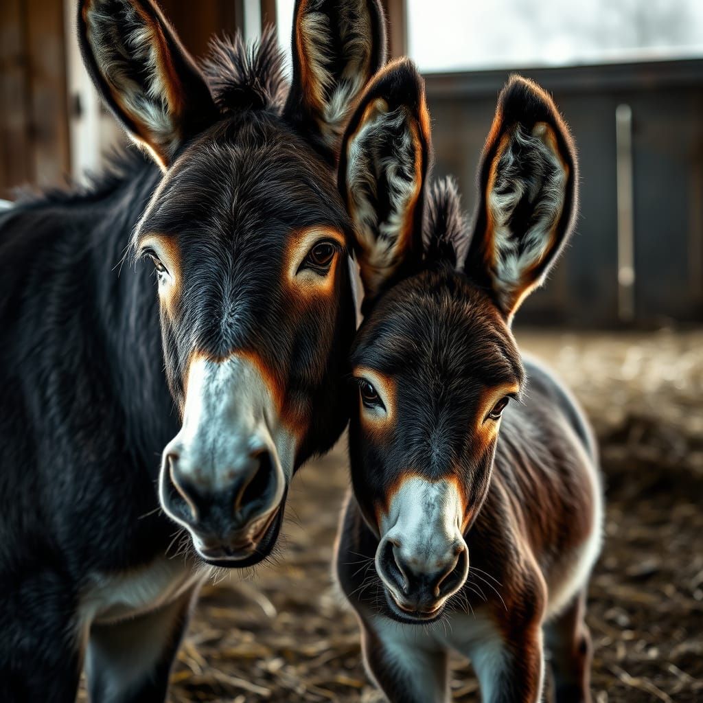 This heartwarming image shows a mother donkey tenderly embracing her adorable baby donkey in a rustic barn setting, captured with stunning hyperrealistic detail and cinematic flair.