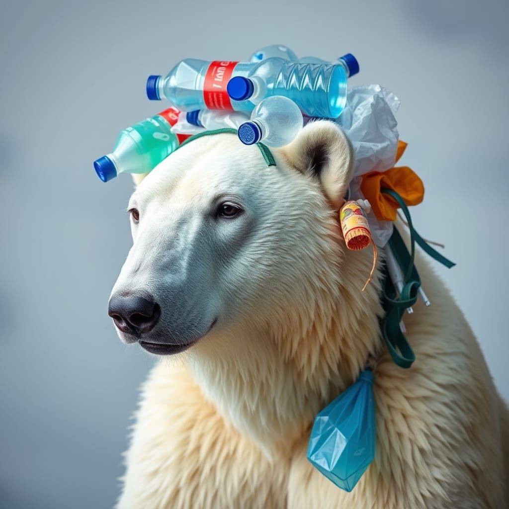 This image depicts a polar bear adorned with a headdress made of discarded plastic bottles and bags, highlighting environmental pollution.