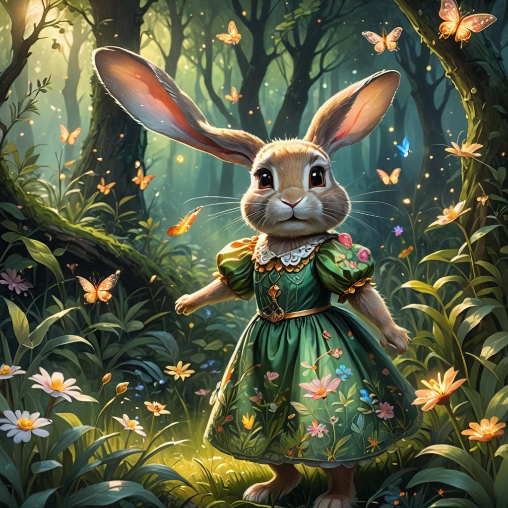 A vibrant oil painting of a rabbit wearing a dress in a forest. The fantasy illustration uses soft light, delicate textures and complementary colors to create a whimsical scene.