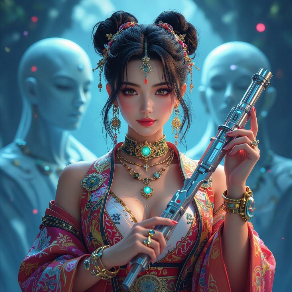 This image shows a beautiful woman in colorful, detailed clothing and futuristic jewelry, holding a metallic object. The background features ethereal figures, rendered as hyperrealistic 3D anime art in breathtaking 8k resolution.