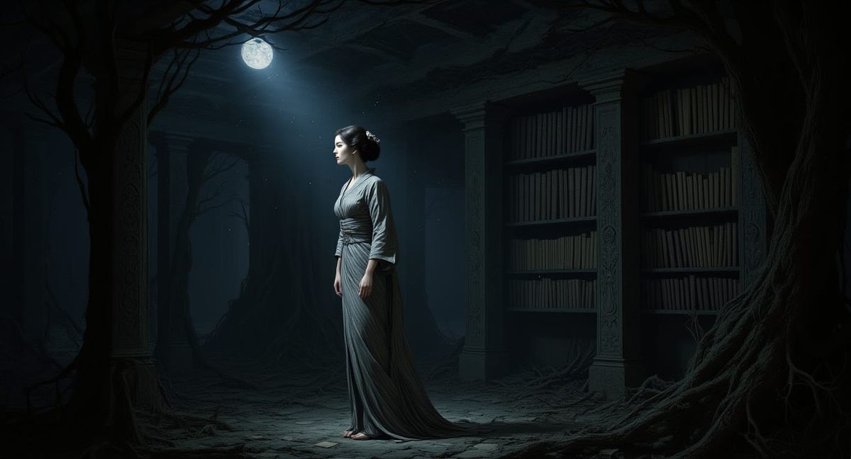 This image depicts a solitary Geisha in a worn kimono within a decaying library. The scene blends dark fantasy concept art with impressionistic and cubist elements, creating melancholic beauty.