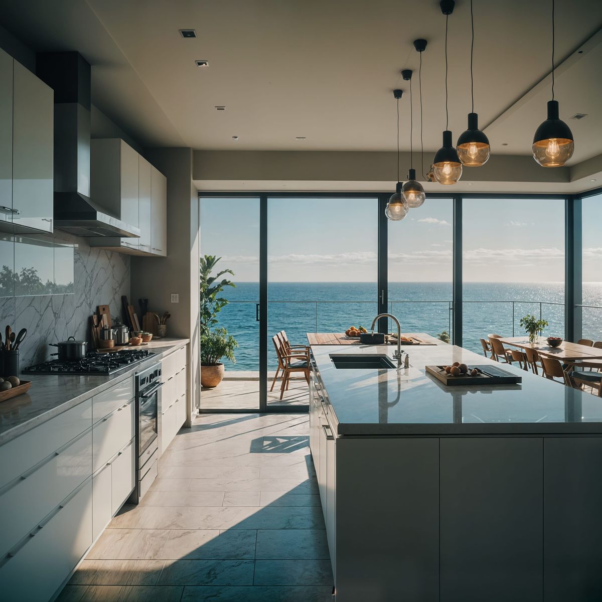 This cinematic film still showcases a modern kitchen with a breathtaking view of the sea. Shot with high-quality filmmaking techniques for a dramatic and atmospheric feel.