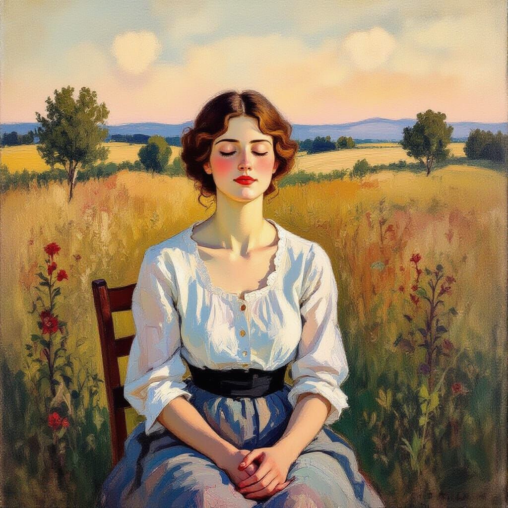 This image shows a woman meditating in nature, eyes closed and smiling peacefully. The artwork features warm colors and expressive lines in a modern art style.