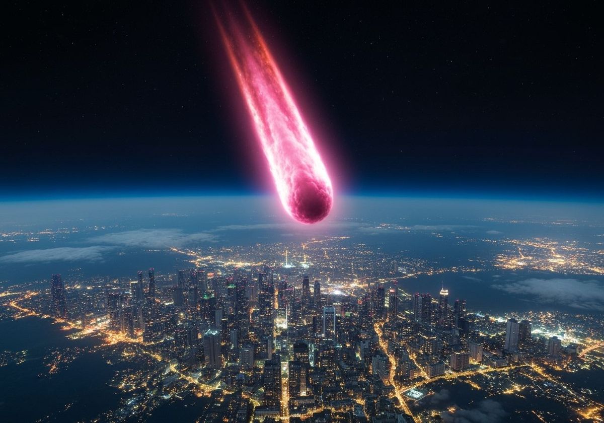 A realistic, award-winning photograph captures a blazing pink marshmallow meteor descending through the night sky towards a brightly lit cityscape.