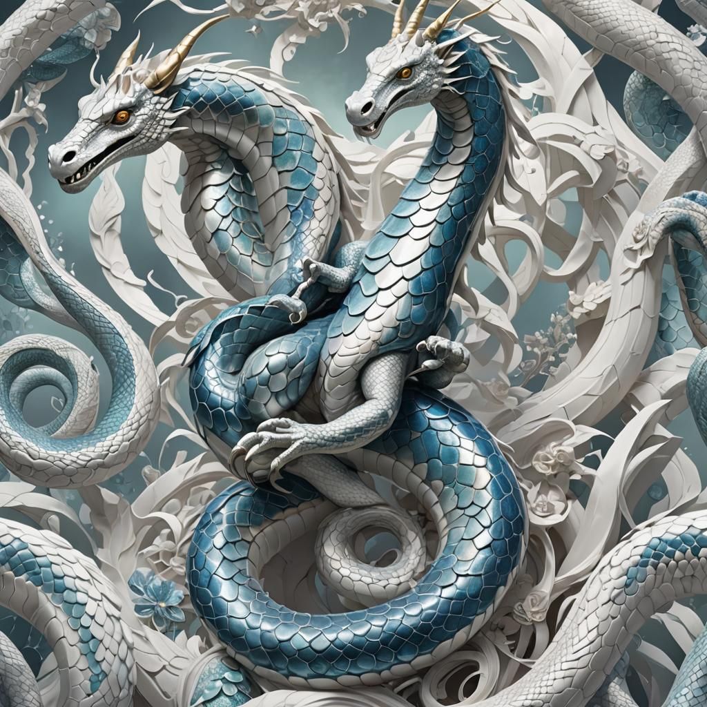 This image shows a hybrid creature with the body of a white cobra and unicorn features. The scales shimmer with iridescent silver and blue, and hood-like ivory protrusions adorn its head.