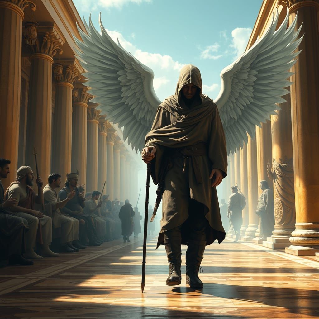 A solemn wanderer walks unnoticed through the golden halls of Olympus as gods feast. Celestial wings flicker behind them in this surreal and intricate digital artwork.
