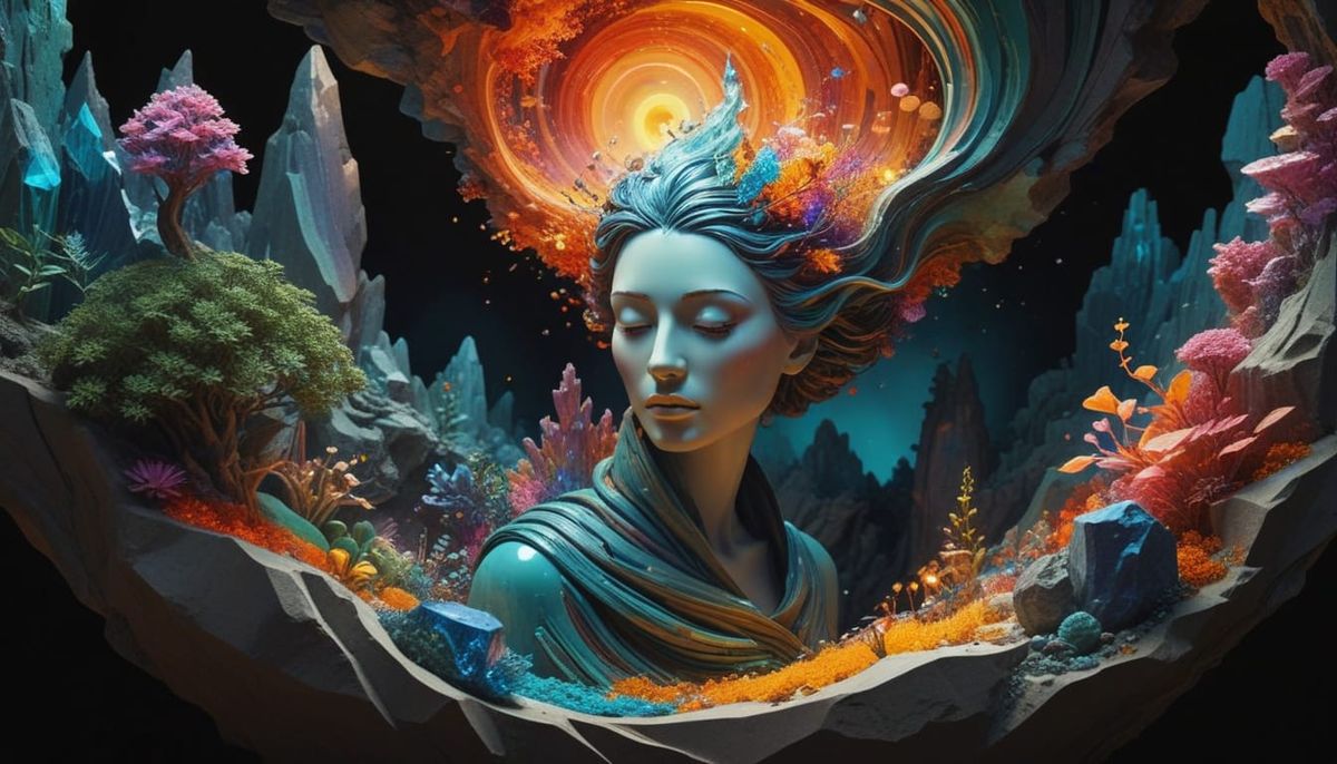 This image shows a surreal diorama of a woman's face amidst swirling colors and fractals. Sentient plants and rocks communicate with light in a cavern filled with glowing crystals, in a psychedelic style.