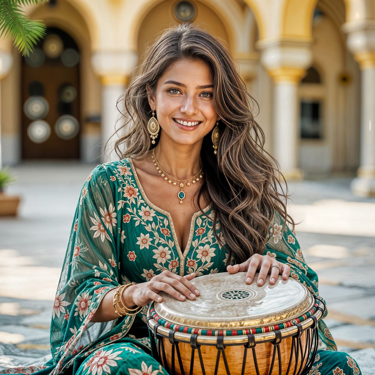 This image shows a beautiful young woman playing a darbuka with excellent choreography. The vibrant colors and dynamic composition capture the energy of the musical performance.