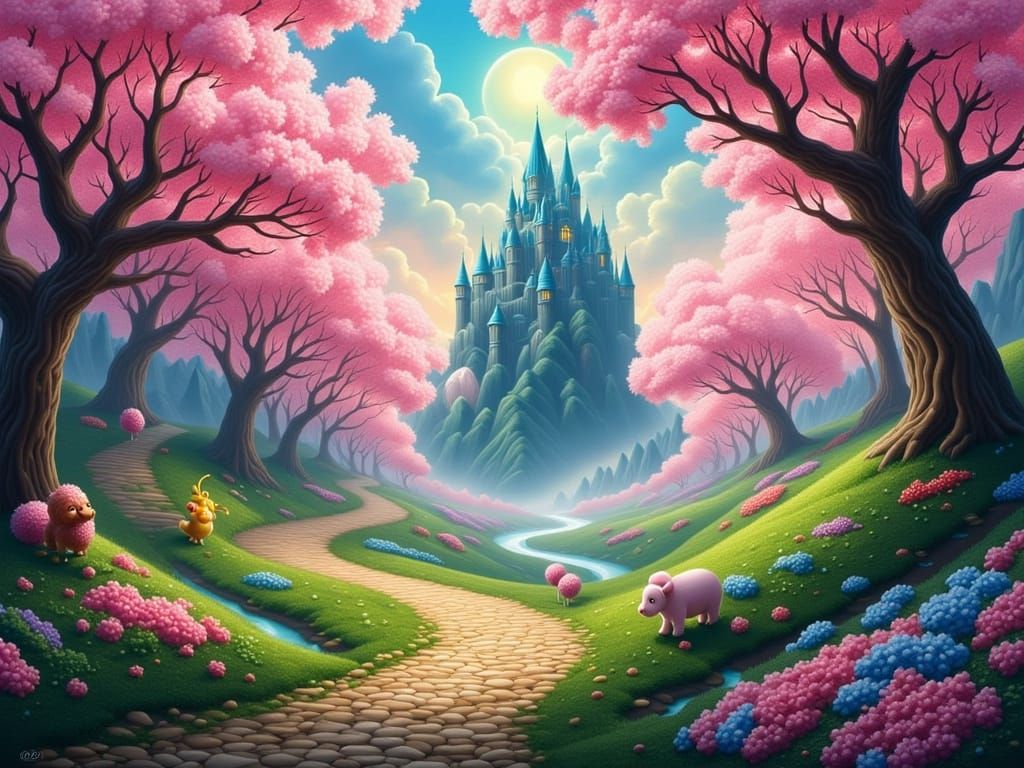 This image shows a winding cobblestone road framed by cherry blossoms, bathed in sunlight, with animals on either side. A dark castle looms in the distance under a thunderstorm, in a hyperrealistic digital art style.