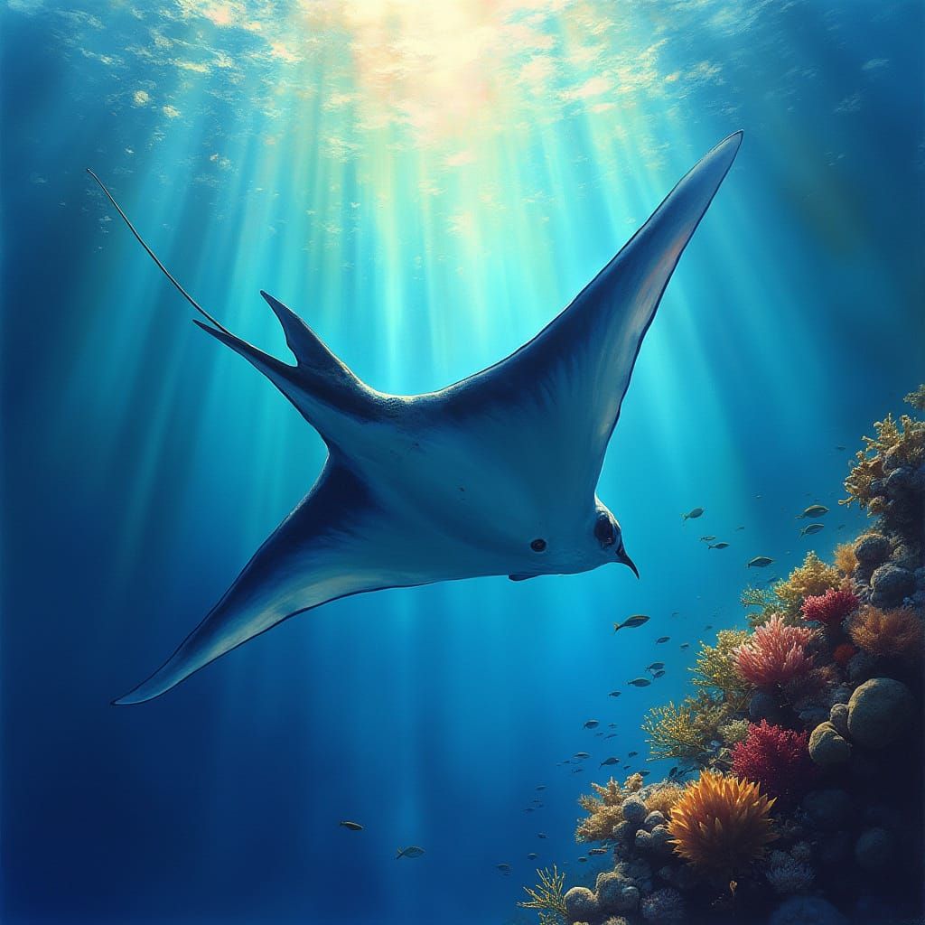 A vibrant watercolor painting captures a manta ray swimming near a coral reef. Sunlight creates an ethereal glow through shimmering water with refracted light in this impressionistic scene.