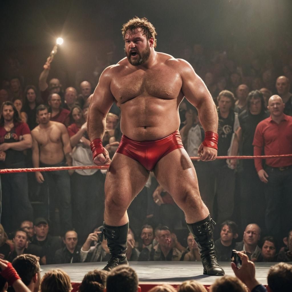 A vibrant photograph of a large, older wrestler in a dynamic pose. The image features dramatic lighting and intense shadows within a wrestling ring setting, capturing the energy of a stadium night.