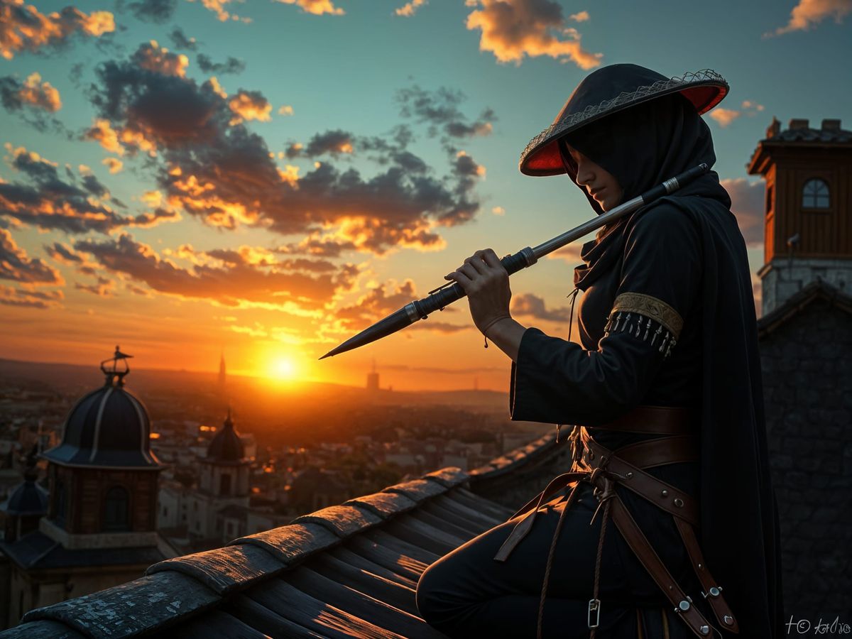 The assassin woman spins a piccolo on her fingers and waits patiently on the thatch rooftop for the sun to set, a blade in her other hand