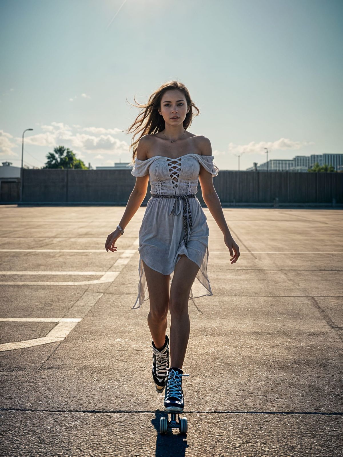 A hyperrealistic image of a woman rollerskating through a parking lot. The woman is wearing a torn off-the-shoulder dress. The image has a cinematic, atmospheric style.