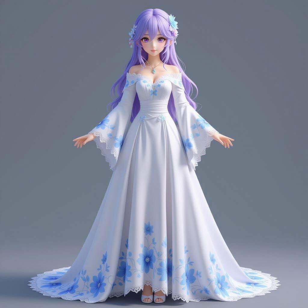 This image showcases a young woman in a white gown with baby blue floral accents, featuring lavender hair and a decorative hairpiece. Presented in a 3D anime art style with high detail and luminous textures.