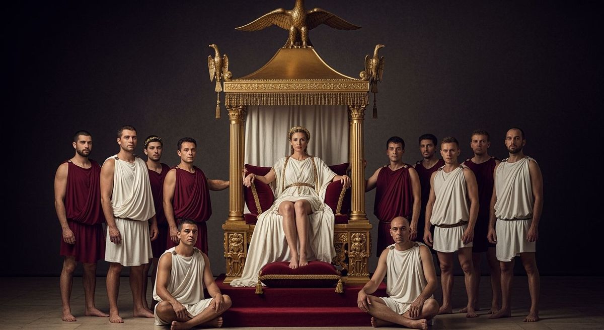 This image shows a Roman Empress seated on an ornate golden throne, attended by servants. The image is reminiscent of professional portrait photography, with natural lighting and a sharp focus.