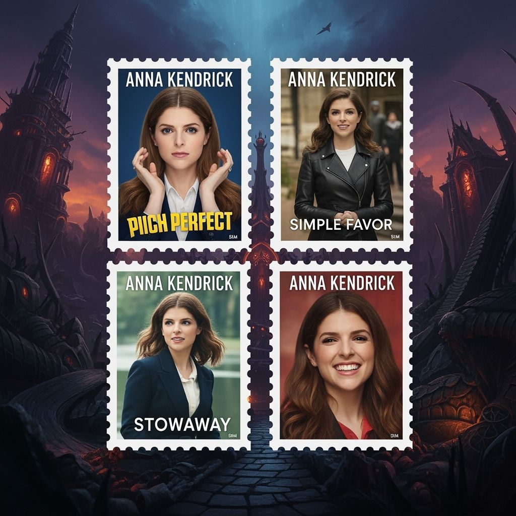 A collection of four detailed postage stamps honoring Anna Kendrick, featuring her roles in Pitch Perfect, A Simple Favor, and Stowaway, plus a portrait. Rendered as a matte painting with deep colors.