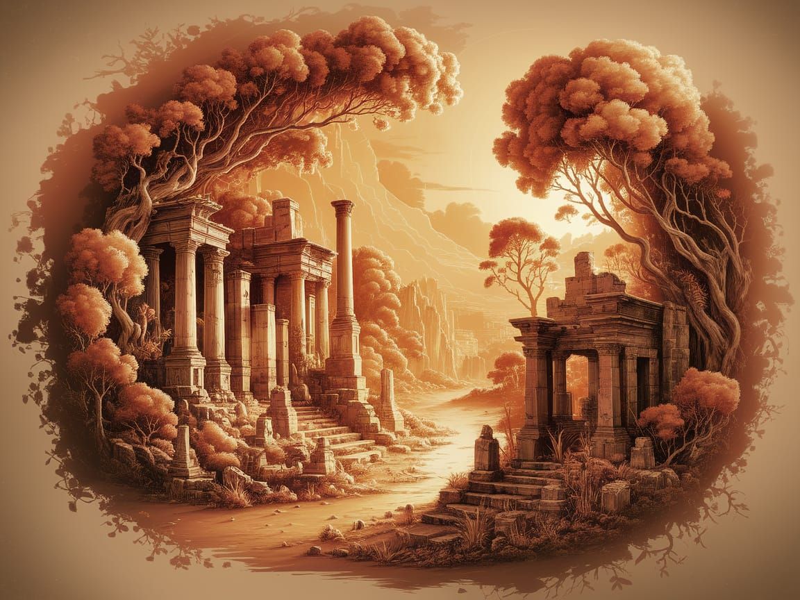 A mesmerizing splash screen of a fantastical landscape bathed in warm, golden light. Ancient ruins and whimsical flora are rendered in hyper-detailed charcoal drawing with vintage sepia tones.