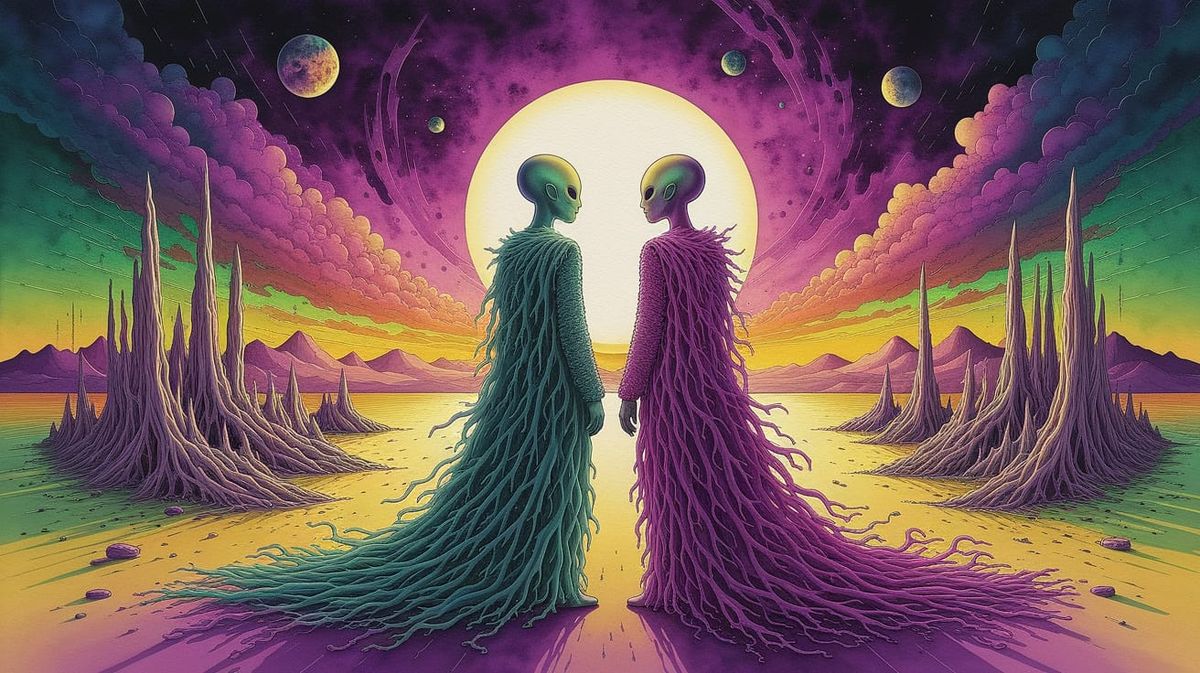 This image is a surreal blend of science fiction and mysticism, featuring dual, androgynous figures standing at the edge of a desolate dreamscape, surrounded by twisted biomechanical ruins and a vivid, fiery sky.