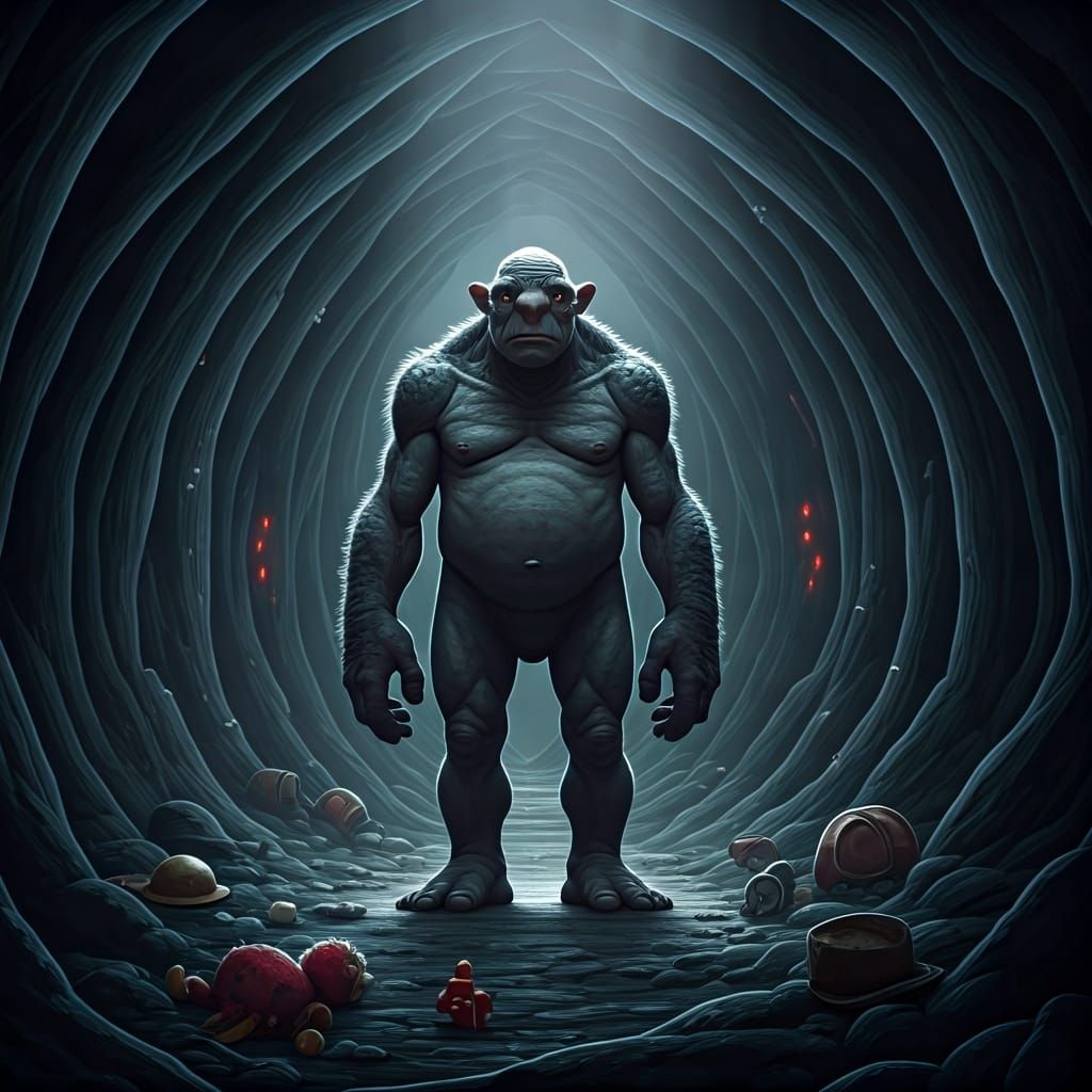 This image shows a solitary troll in a dimly lit cave. The scene is rendered with cinematic lighting and strong shadows. Broken toys and other items surround the troll, adding to the mysterious and emotional atmosphere.