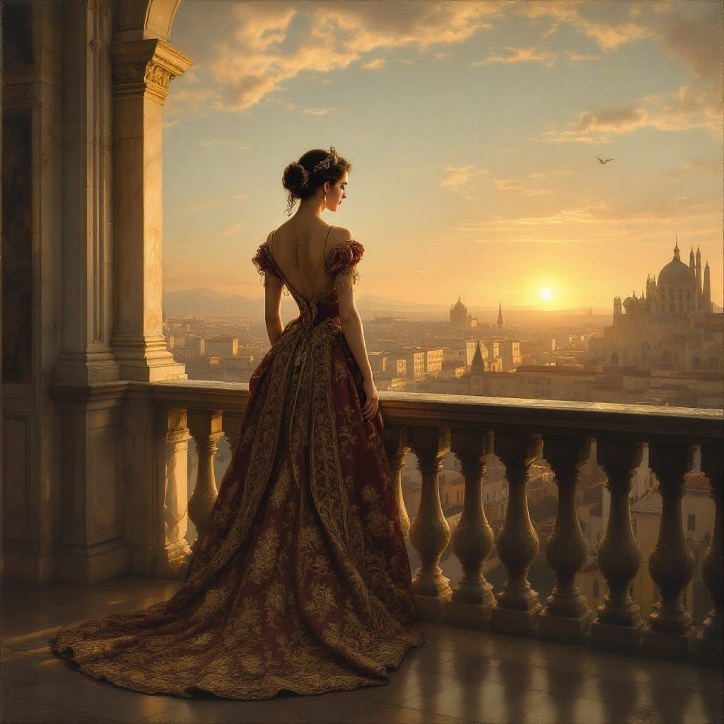 This image depicts a noblewoman standing on a marble balcony at dawn, surrounded by the soft hues of a Renaissance cityscape, with delicate sfumato and chiaroscuro techniques capturing the subtlety of the scene.