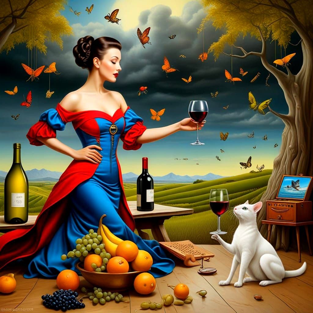 bizarre fantastic surrealistic composition by by Johfra Bosschart, Evandro Schiavone, Dorothea Tanning, Igor Morski, David Michael Bowers, Tanya Shatseva, Esao Andrews, Pablo Amaringo, featuring wine bottles, wine glasses, refrigerator, kangaroo