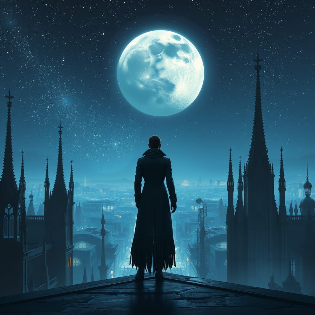 A figure stands on a rooftop overlooking a gothic cityscape. The night sky is filled with stars and a glowing moon, rendered with dramatic lighting as concept art.