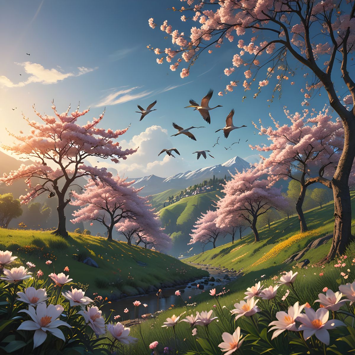 This stunning digital illustration captures the beauty of spring, featuring a majestic school of cranes soaring against a brilliant blue sky amidst lush green hills and blossoming fruit trees. Delicate details and soft textures bring this serene scene to life.