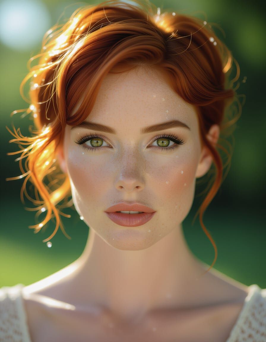 A striking picture of a beautiful woman with a pixie haircut and red hair. The close-up shot features beaded droplets on her skin, with warm light and subtle film grain. The image evokes a sense of atmospheric drama.