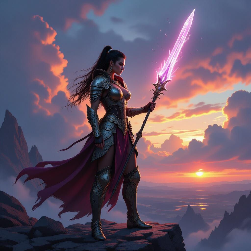 This image showcases a detailed female warrior in polished armor, holding a glowing crystal spear on a rocky peak. Epic fantasy concept art with dramatic lighting and atmosphere.