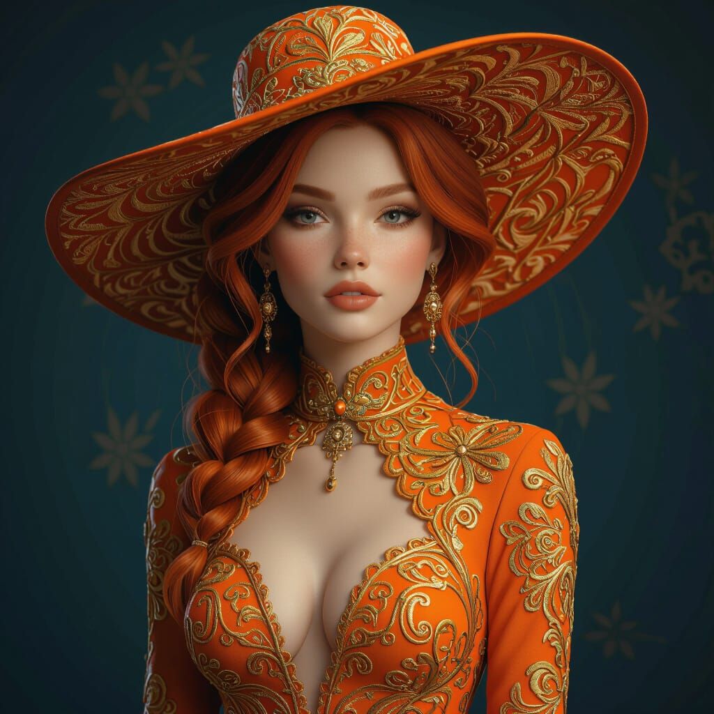 A hyperrealistic image showing a beautiful auburn-haired woman in an ornate golden dress and stylish hat. The image features deep colors and intricate details reminiscent of digital matte painting.