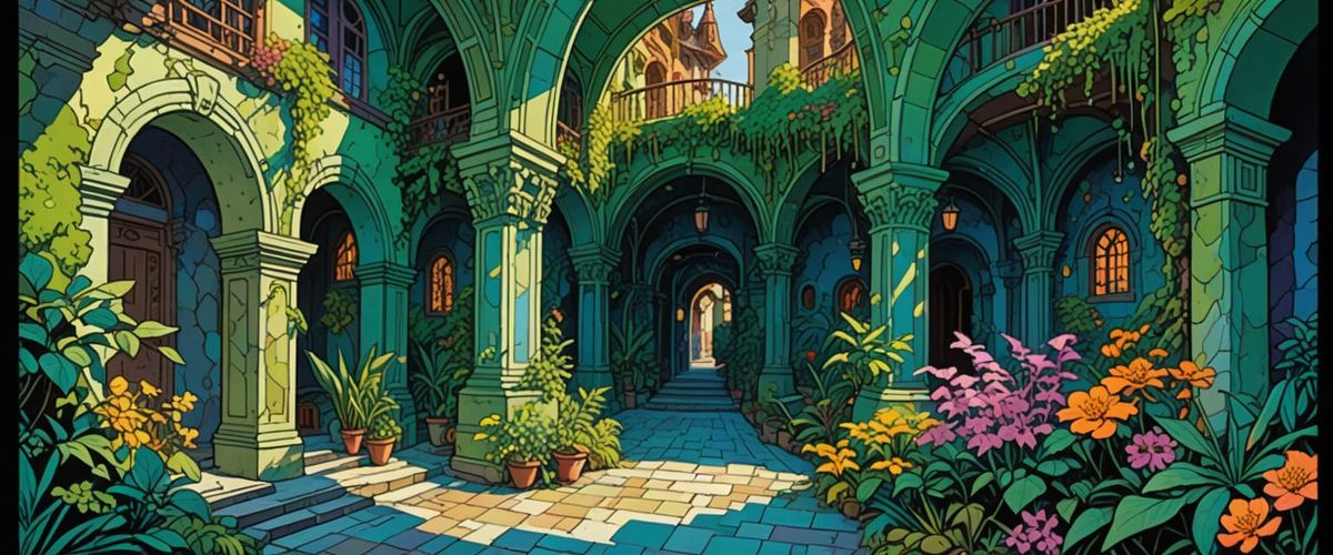 This image shows a person walking through mysterious catacombs with benches. The comic book style scene features vibrant white and mossy green stone walls, exotic plants, and volumetric lighting.