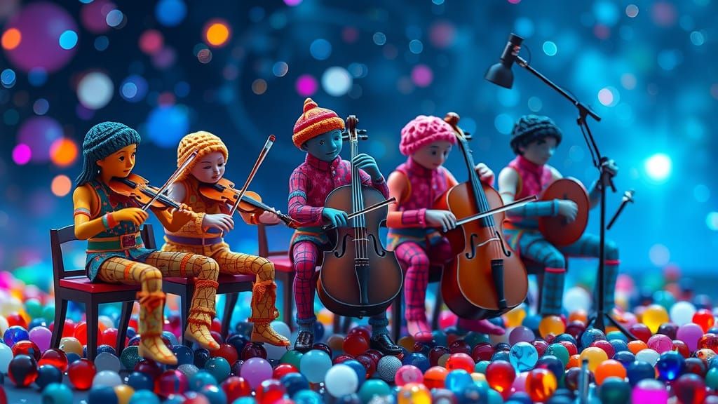 This image shows a vibrant orchestra of beads, each bead a different size, color, and texture, playing a unique instrument in a fantastical dreamscape. The image is in a whimsical, surreal style.