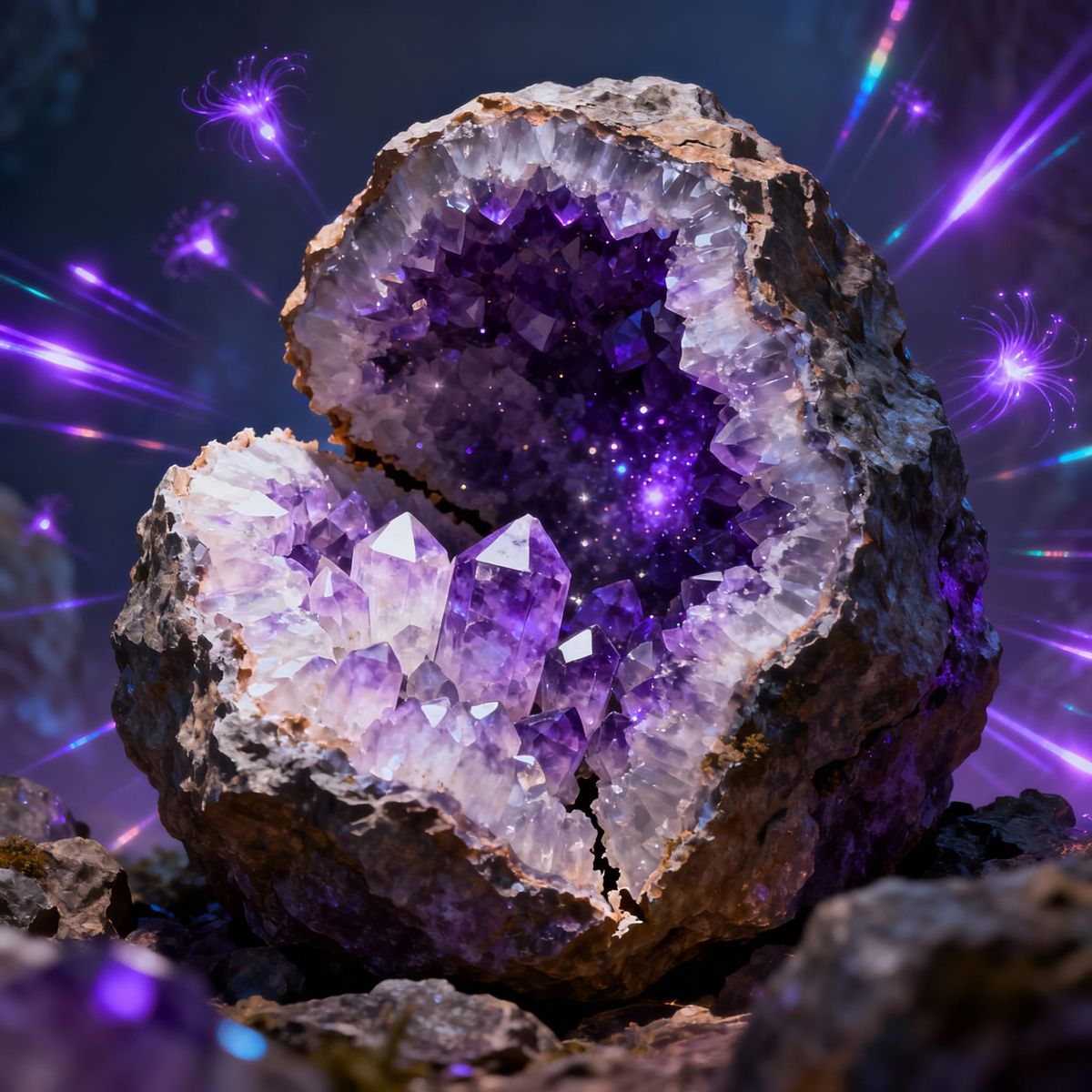 This fantasy concept art showcases an open amethyst geode with a rocky exterior, revealing a sparkling interior. Crystals range from pale lavender to deep purple, with iridescent bioluminescent rays floating around. Features dynamic and vivid colors.