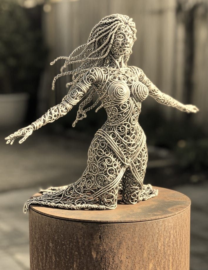 This image shows a wire sculpture of a woman standing on a rusted pedestal. The artwork is crafted from intricately twisted metal wire, creating a unique form.