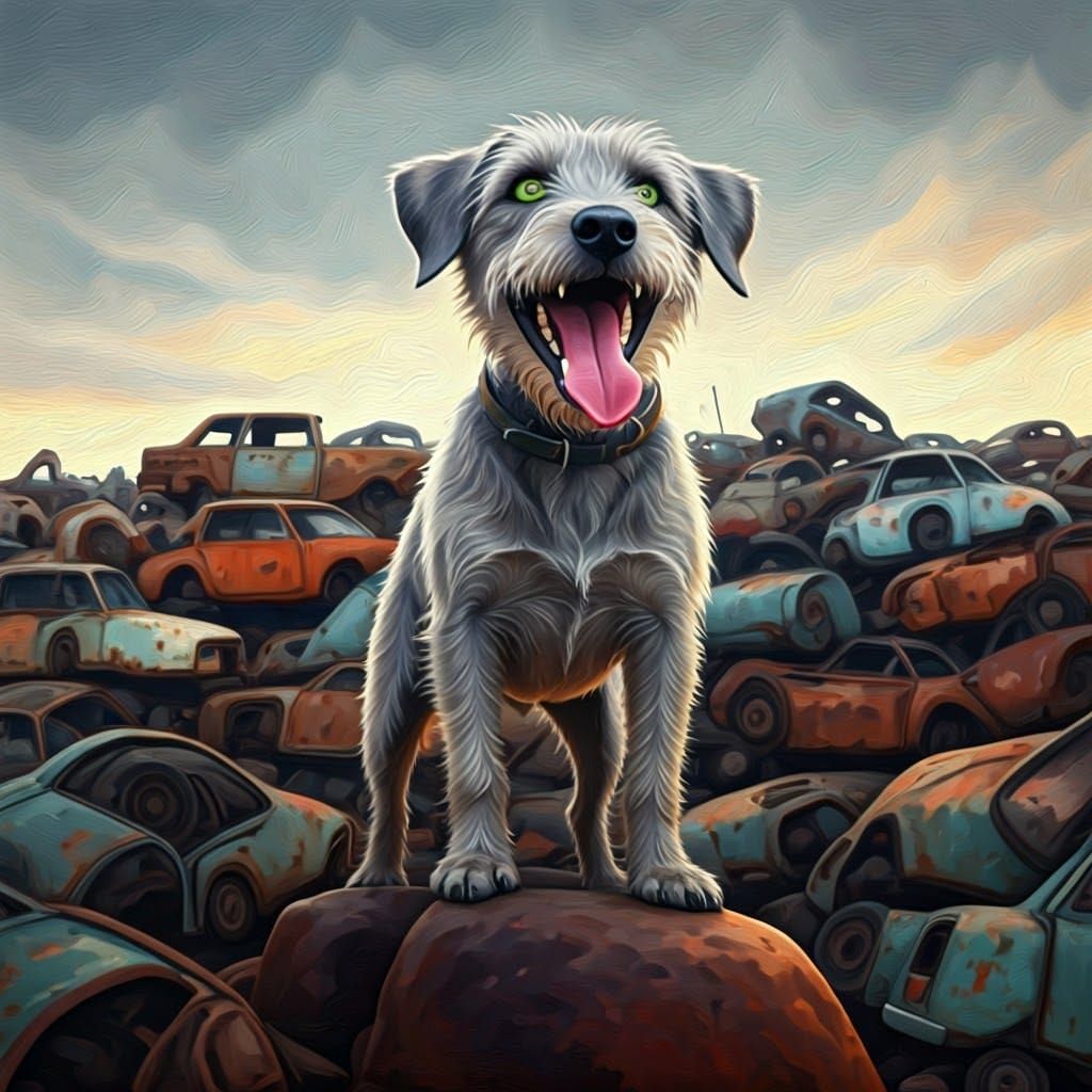 A striking picture of a thin, grey, excited dog with bright green eyes standing on a junkyard pile. Thick brushstrokes and vibrant, rough textures give the scene an abstract expressionist style.