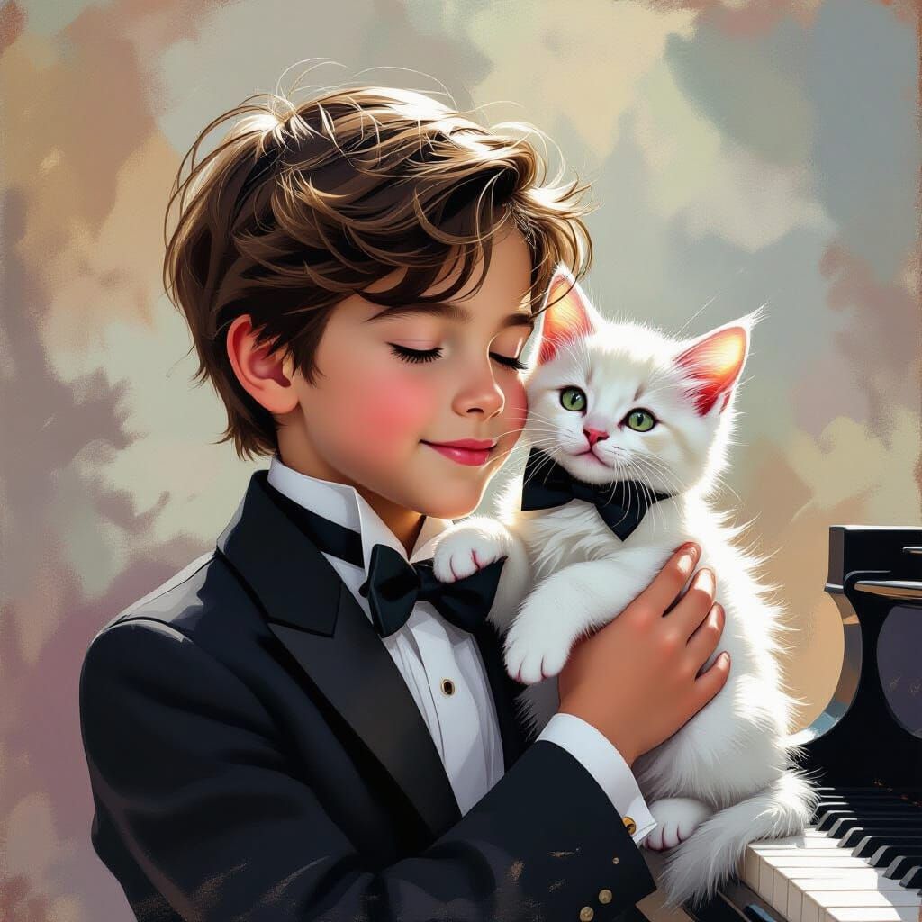 This hyperrealistic image shows a pianist in a tailcoat lifting a white kitten with a bow tie. The concept art style features intricate detail and dramatic lighting.