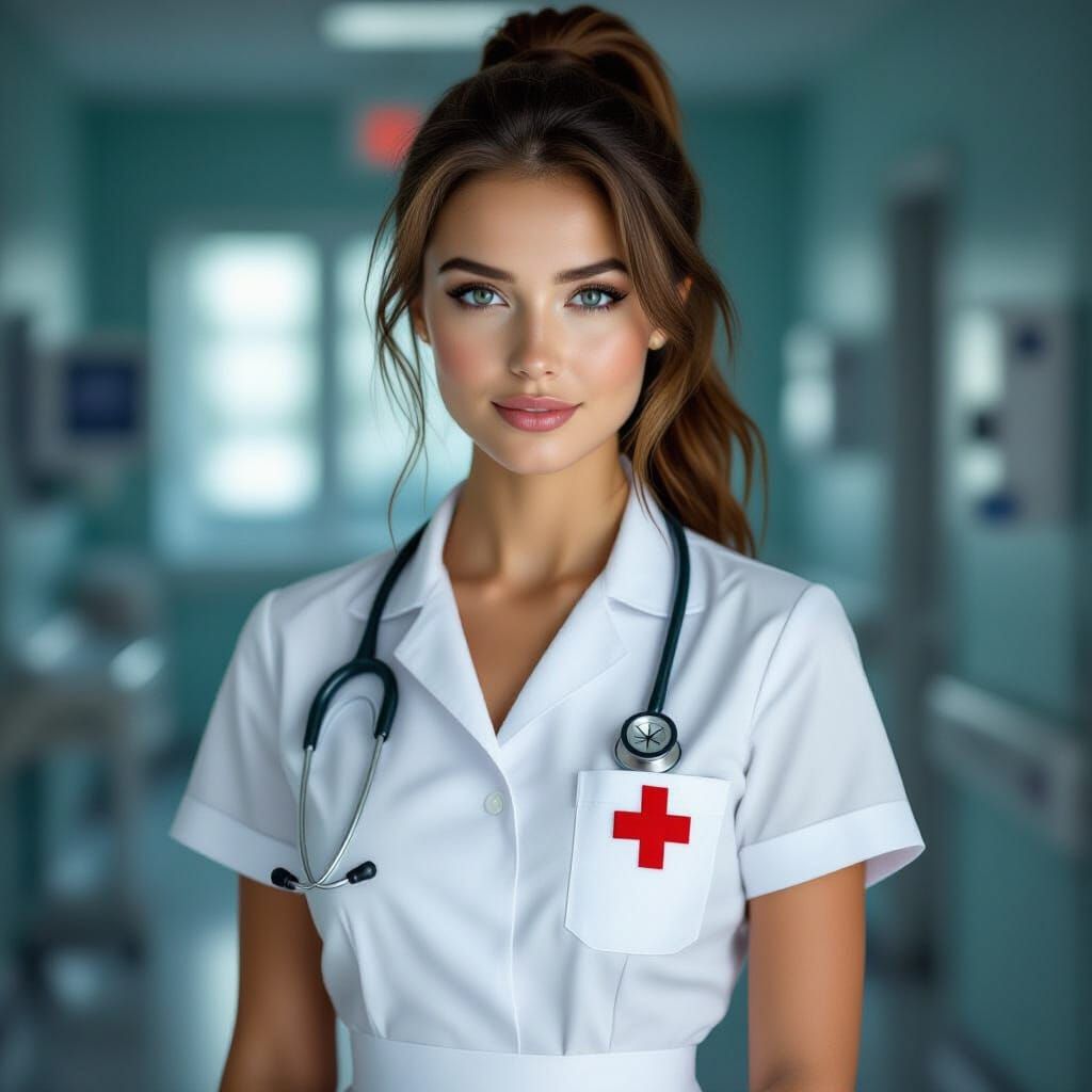 A photorealistic image of a young nurse with brown hair and piercing eyes in a hospital setting. The crisp details and textures evoke hyperrealism.