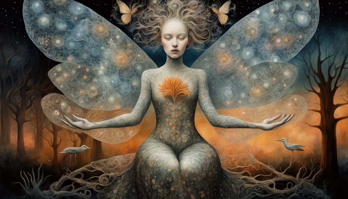 This image showcases a fragmented sculpture of a woman with iridescent wings, emerging from a forest. Her form blends organic, botanical, and mythological elements with a dreamlike, surreal aesthetic.