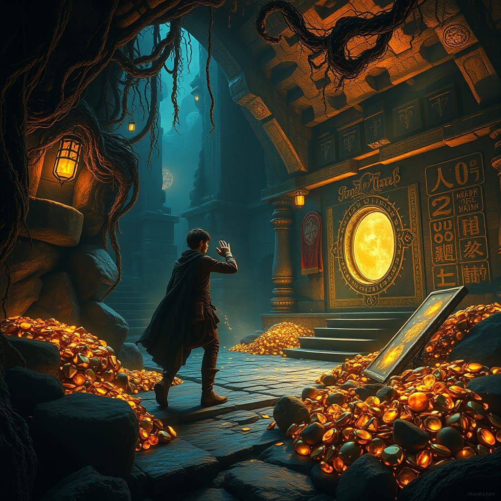 Hidden deep within an ancient, overgrown temple, a secret vault bursts open, unveiling mountains of gold, glowing gemstones, and powerful enchanted artifacts. Mystic runes flicker on the walls, whispering secrets of lost civilizations. Golden light spills dramatically across the chamber as a lone explorer reaches for the legendary relic at its heart, caught between fortune and fate. Adventure fantasy, cinematic lighting, ultra-detailed 16K NFT art.