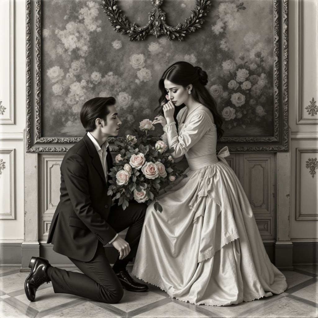 This artwork depicts a Victorian gentleman kneeling with roses, while a lady blushes nearby. Rendered in charcoal and wafoto styles with dramatic realism and romanticism.