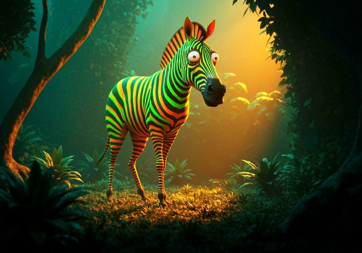 A bizarre zebra with long legs and wide eyes stands in a jungle. The scene is awash in psychedelic colors with dark shadows, reminiscent of underground comics and rendered as 3D digital art.