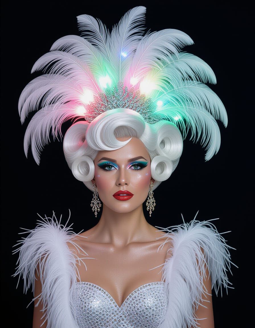 This image shows an elaborate hairstyle incorporating glitter, feathers, and sequins, reminiscent of a vintage cabaret showgirl. The subject is set in a sunlit flower meadow with a blue sky and butterflies.