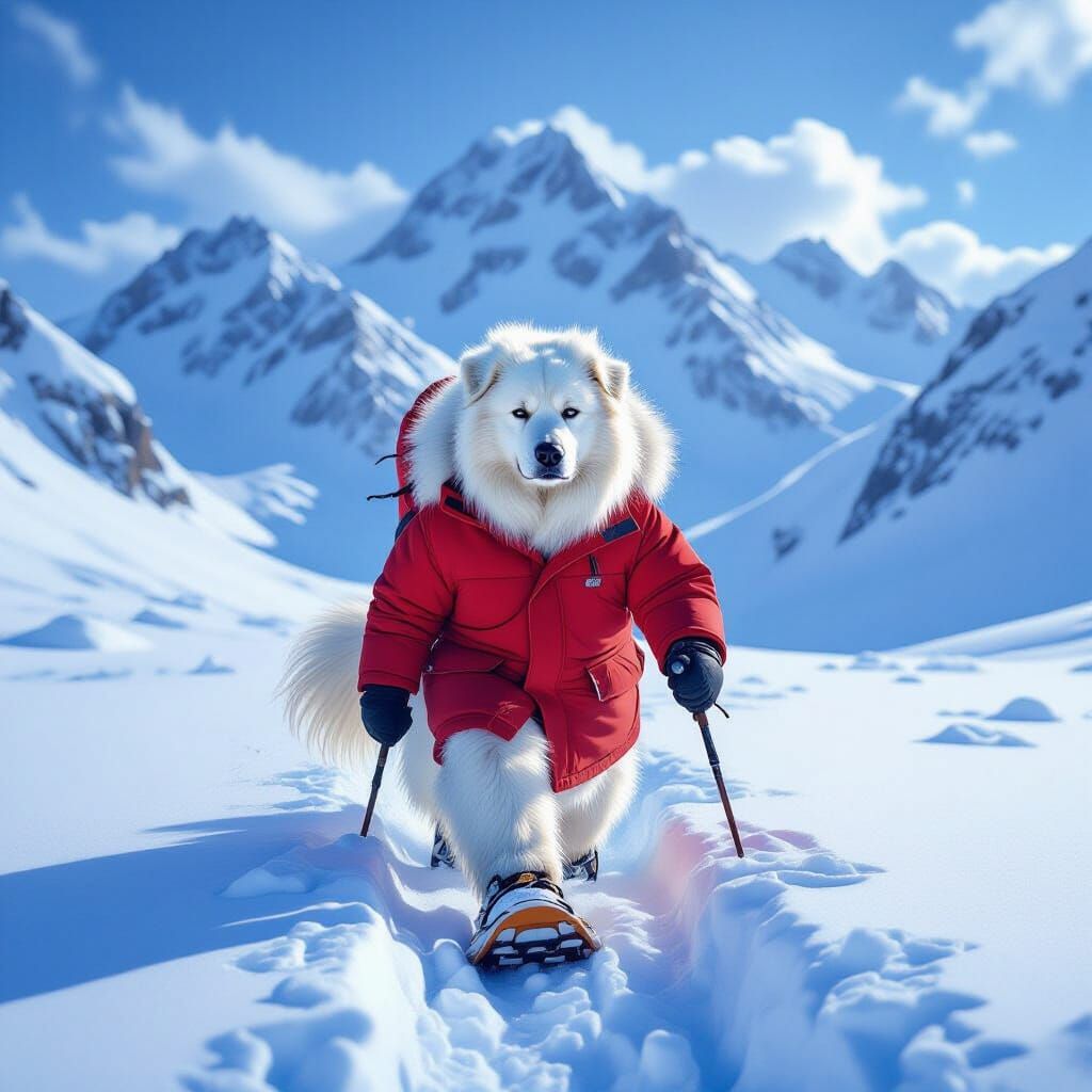 This image shows a majestic Great Pyrenees dog wearing a red parka and snowshoes, trekking through a snowy mountain pass with dramatic lighting and long shadows. It evokes a sense of solitary determination.
