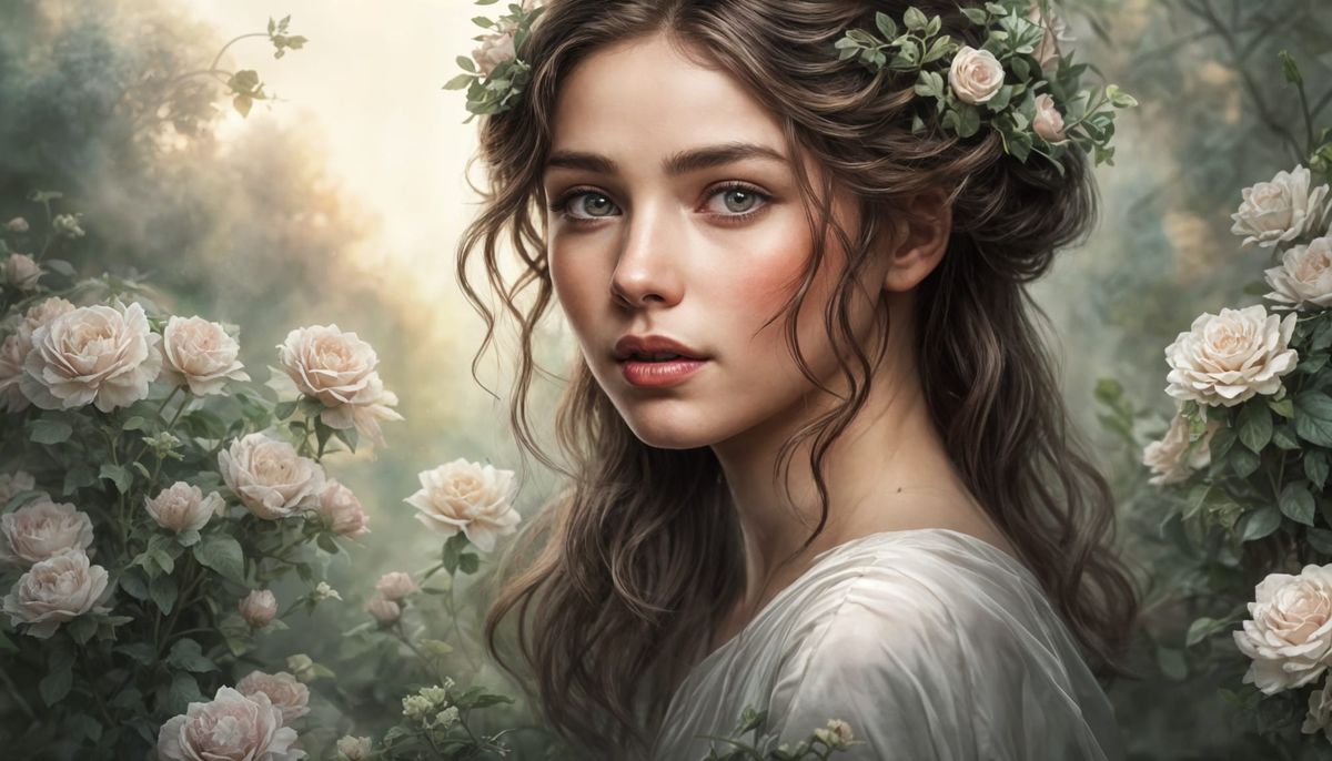 A striking picture of a slender, youthful girl with dark brown braided hair. The image showcases a cinematic quality with incredible realism and attention to detail, set against a lush, atmospheric backdrop.